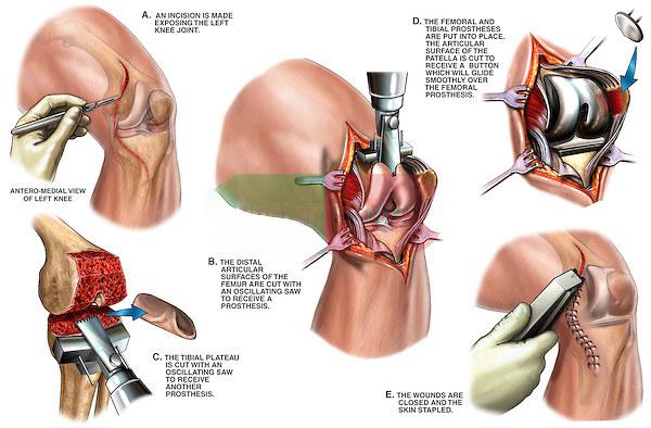 Knee replacement surgery — also known as knee arthroplasty _ can help relieve pain and restore function in severely diseased knee joints. The procedure involves cutting away damaged bone and cartilage from your thighbone, shinbone and kneecap and replacing it with an artificial joint (prosthesis) made of metal alloys, high-grade plastics and polymers.